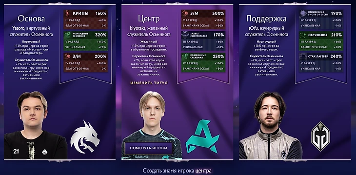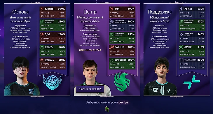 Отталкиваясь от своих эмблем и информации с сайта, я поставил таких игроков: Shiro, Malr1ne и 9Class. По данным сайта, каждый из этой троицы входит в топ-3. Но я выбрал именно их, потому что: