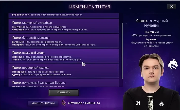 Здесь все очень зависит от игрока. От его пула героев, их уровней Dota+, носит ли он Арканы и даже того, как часто его типают. Например, при выборе Малрина в мид смело ищите ему первую часть «Виртуозный». Она дает +13% ко всем очкам при игре за героя разряда «Мастер» или «Грандмастер».