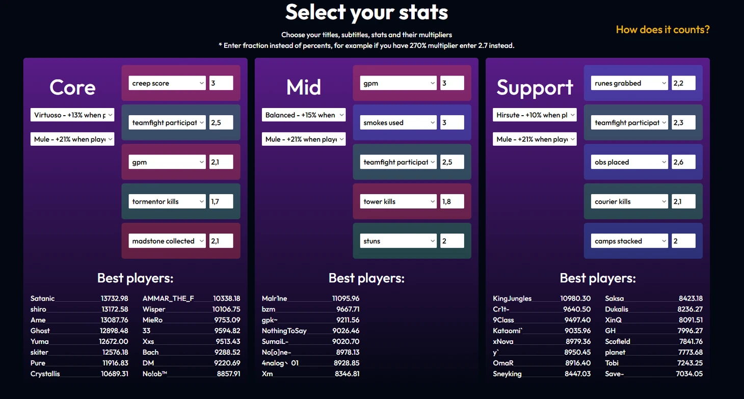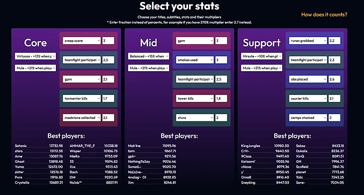 Энтузиасты сделали сайт, который позволит вам подобрать лучшую тройку игроков, отталкиваясь от эмблем и титулов. Просто вводите ваши показатели, переводя проценты в множители (например, 220% - это множитель 2,2).