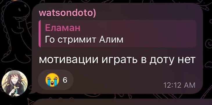 P.S. Я просто напомню, что 2-й командой в квале на TI в самом сильном регионе Дота 2 были Cyber Goose с Solo. Старый, пора камбекнуть по-быстрому 🤓».
