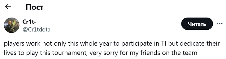 Организации не должны лишать игроков возможности сыграть на TI. Это не должно зависеть от юридических моментов. Это, безусловно, худший вариант для всех (особенно для игроков). Печально наблюдать за этим».