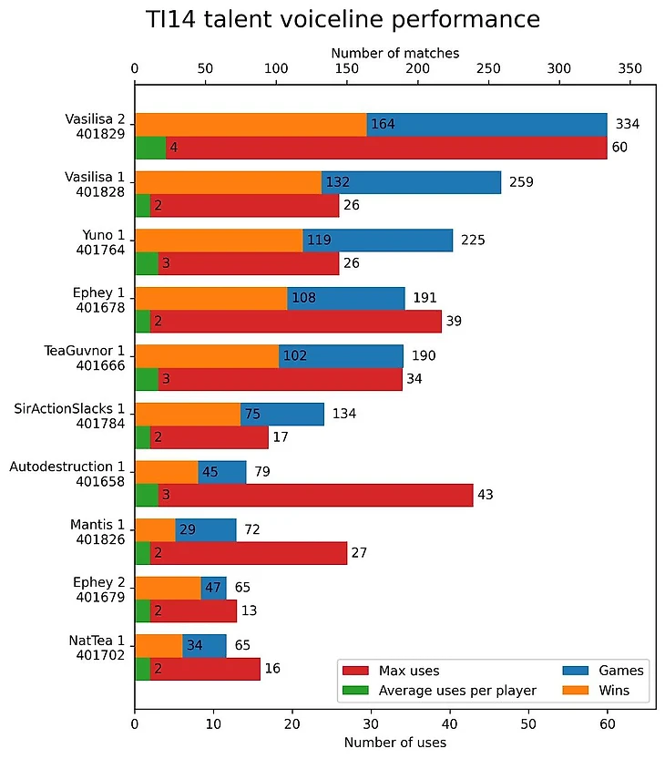 На Реддите появилось исследование, в котором подсчитали использование новых войслайнов на выборке из 10 000 матчей. Топ-2 по популярности занимают обе фразы Василисы, а «Киси-киси, мяу-мяу» на первом месте с результатом в 334 игры и отрывом почти в 100 от второго места!