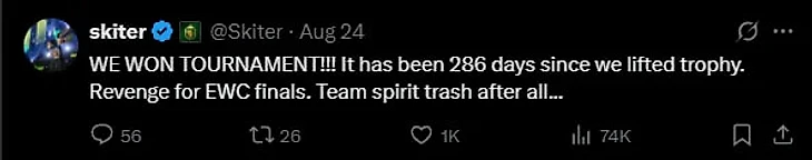 💬 «МЫ ВЫИГРАЛИ ТУРНИР!!! Прошло 286 дней с тех пор, как мы поднимали трофей в последний раз. Реванш за финал EWC. Spirit все-таки мусор».
