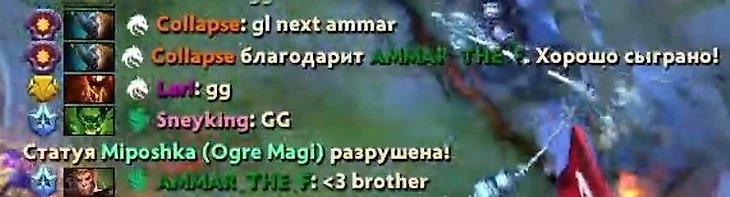 Перед игрой Аммар написал «Один из нас заберет все», а Коллапс ответил «GL, Ammarchik». После победы Falcons Магомед пожелал Аммару удачи на турнире, а тот ответил сердечком и назвал оффлейнера братом.