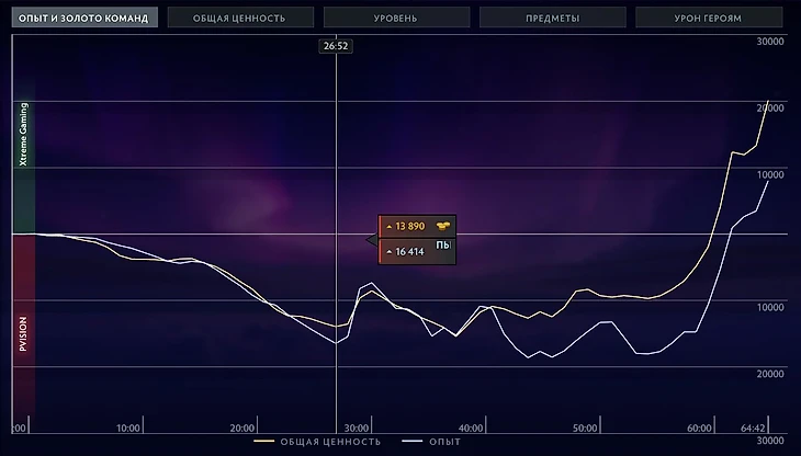 На третьей карте к получасу игры PARIVISION вела ~14 тысяч золота.