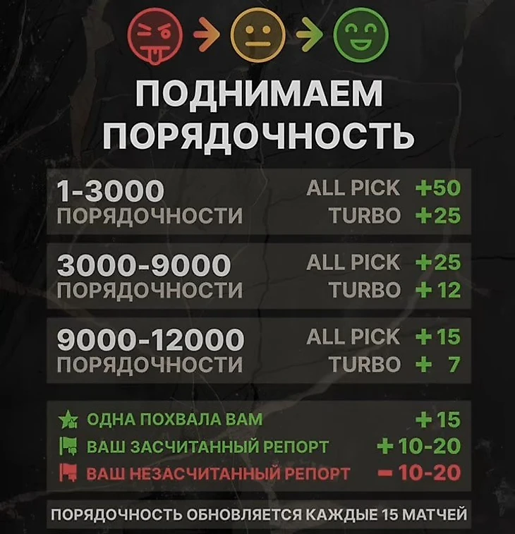 Самое главное правило – просто играть и не давать поводов для жалоб со стороны окружающих (ну и не покидать матчи). Если проблем нет, то со временем все показатели вернутся к прежним значениям.