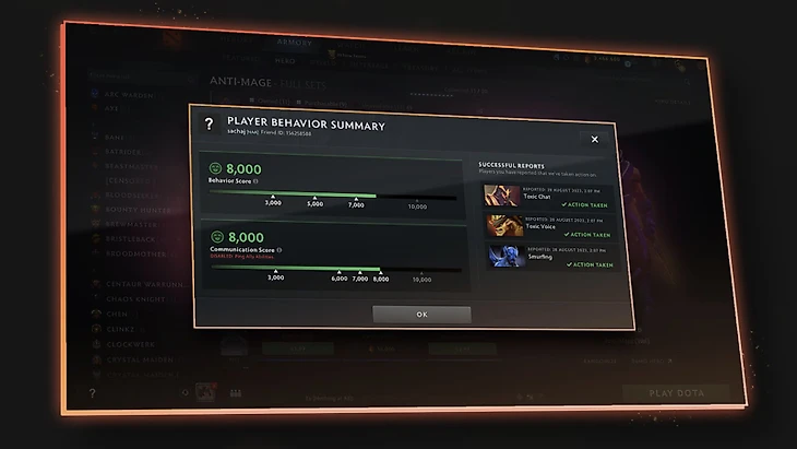 Отдельным пунктом здесь стоят жалобы. Давайте репорты только за настоящие нарушения и желательно сразу. Помните, что случайная смерть или пара добитых саппортом крипов не будут считаться преступлениями – вы лишь потеряете порядочность из-за такой жалобы, так как плохой уровень игры союзника не является для системы причиной для репорта.