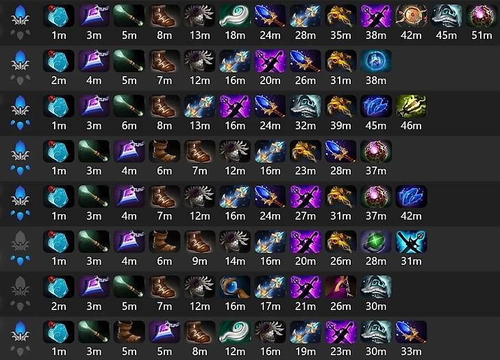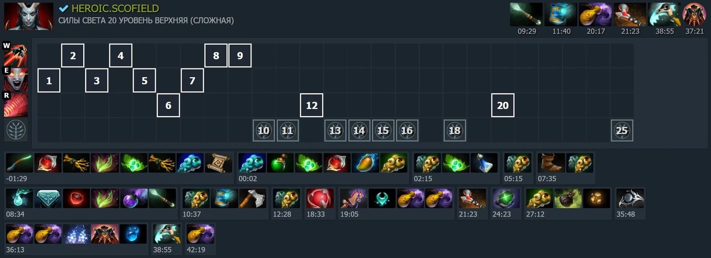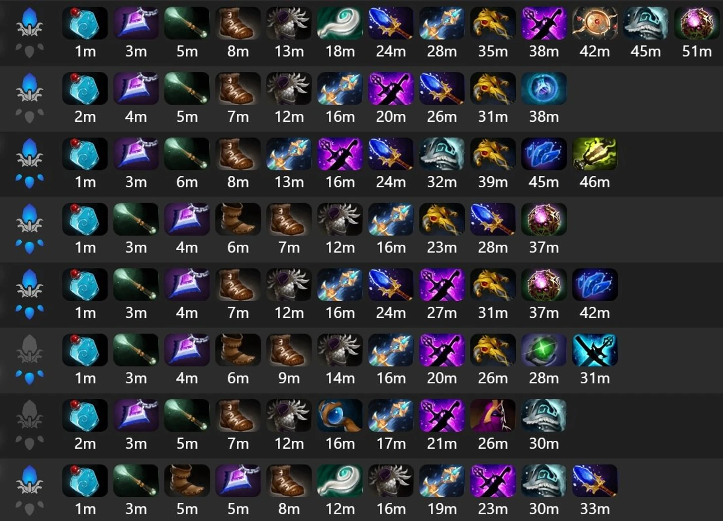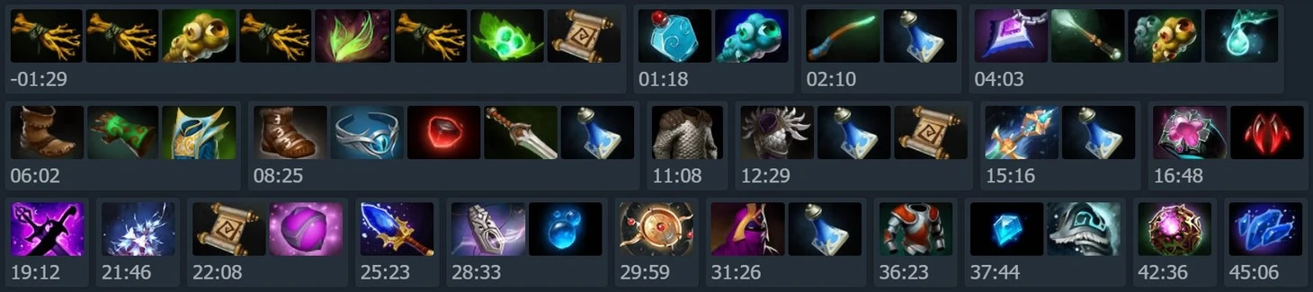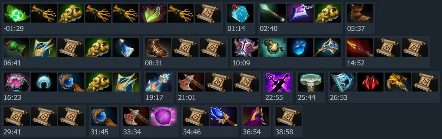По ситуации можно взять Eul’s Scepter of Divinity, более ранний Aghanim’s Shard, Black King Bar, раннюю Linken’s Sphere или Refresher Orb. Ситуативная вариативность имеется, но общая картина ясна.