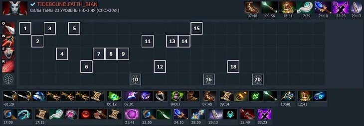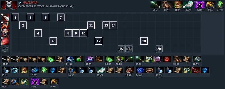 Если линия удалась, а Queen of Pain прекрасно стоит практически любую линию, то она безостановочно бегает по карте, убивает саппортов и других хлипких героев, а также ломает позиционку врага в драках. Благодаря активной и агрессивной игре Квопа без особого упора в фарм получает все необходимые предметы в нужный тайминг – Blade Mail/Dagon и Кайю. Уже с ними числа исходящего от Акаши урона становятся очень значительными.