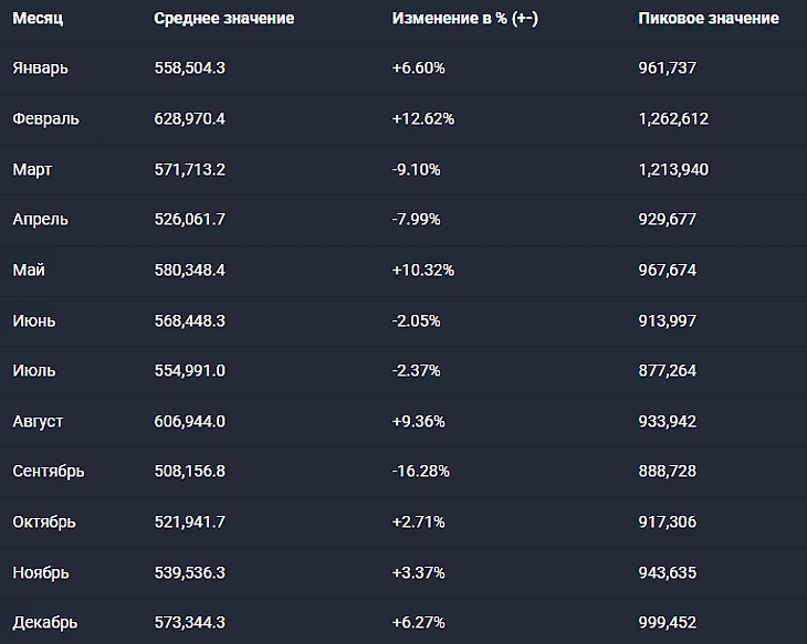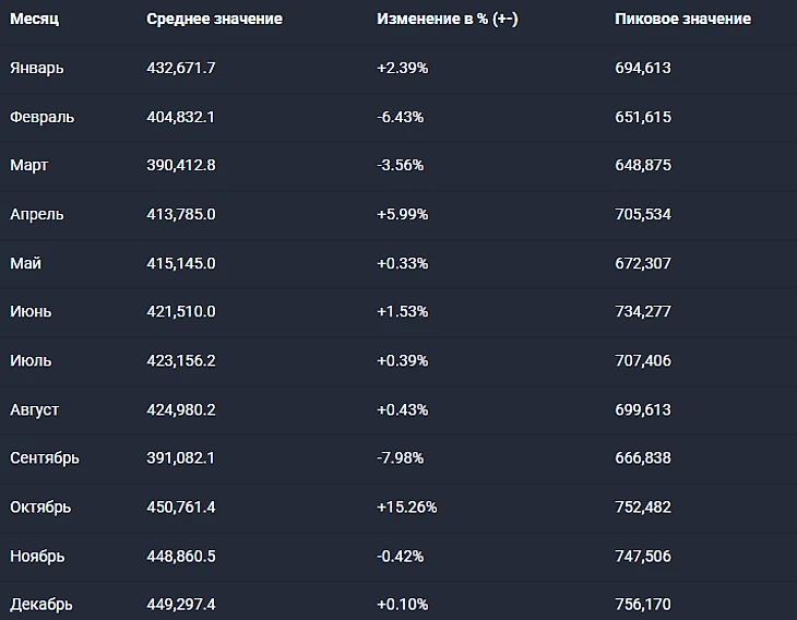 количество онлайна игроков по месяцам (средние и пиковые значения);