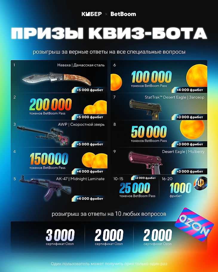 еще 6 победителей розыгрыша получат по 20 000 токенов BetBoom Pass и фрибет 2 000 от BetBoom;