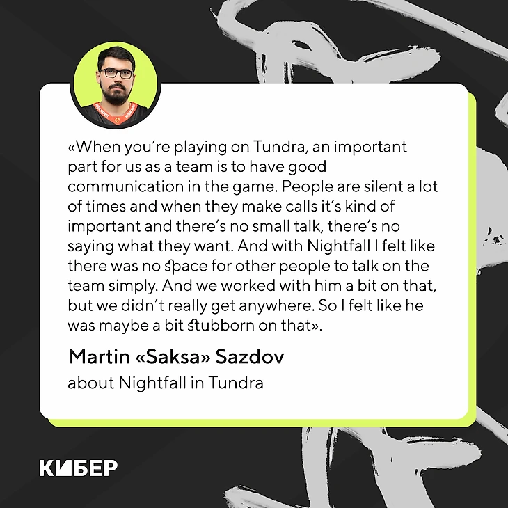 – To be honest, I don’t really dislike him as a person. It’s admirable that he’s really trying to win – of all the players that you notice, he wants to win the most. But I think his approach is kind of feckless, he wasn’t a good fit for Tundra, that’s what I thought. For example, when you’re playing on Tundra, an important part for us as a team is to have good communication in the game. People are silent a lot of times and when they make calls it’s kind of important and there’s no small talk, there’s no saying what they want. And with Nightfall I felt like there was no space for other people to talk on the team simply. And we worked with him a bit on that, but we didn’t really get anywhere. So I felt like he was maybe a bit stubborn on that, and I was unsure if It’s going to get better, because he seems like that type of person, he’s going to talk a lot and I just said that he wasn’t going to be a good fit for us.