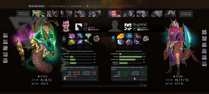 Медуза против Антимага – один из классических керри-матчапов Доты и один из самых полярных. Как правило, для АМ’а это всегда «фришка», а для Дузы – невозможная игра. Статистика подтверждает: Антимаг выигрывает у Медузы чудовищные 62% матчей в нынешней мете. Классика для концептуального контрпика!