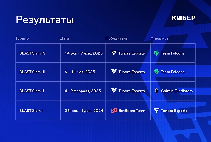 Серии турниров от BLAST совсем недавно исполнился всего год, за который ТО уже провел четыре чемпионата. И за 2025-й Tundra сыграла в финалах каждого из них! Выиграла 3 подряд и лишь в одном уступила BetBoom Team – именно тогда случилась драматичная историческая победа Сэйва над Найтфоллом.