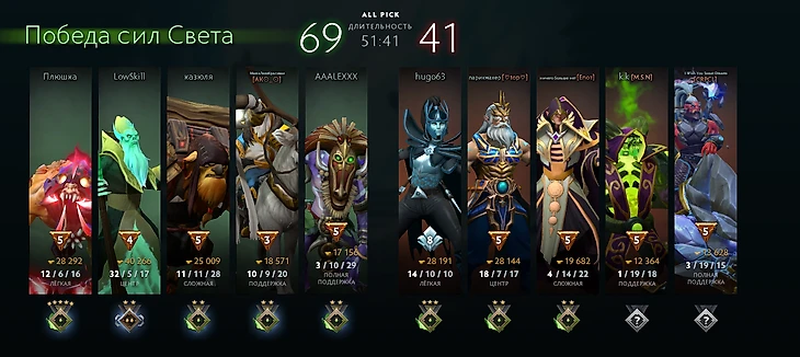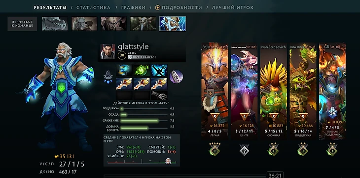 Или четверка-Зевс с KDA 32 и самым большим нетворсом на карте. Собрался он через Рефрешер и три Рапиры, а за игру сделал две рампаги.