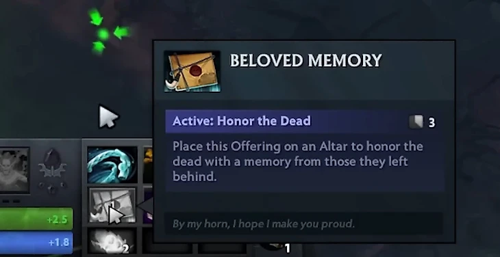 После каждого использования лопаты Муэрта указывала направление к точке, где закопан искомый артефакт – Beloved Memory, письмо какого-то из героев Доты, который с его помощью почитал память умершего близкого.