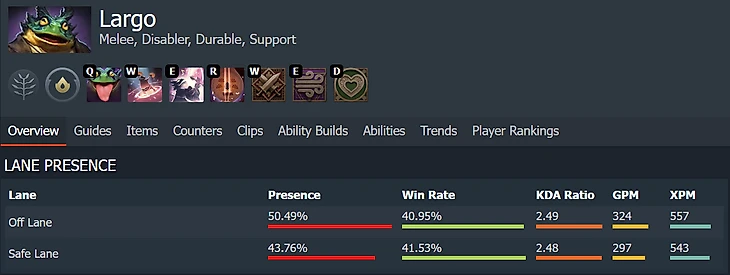 Вместо того, чтобы приносить радость от игры за нового героя, Largo просто руинит катки. На старте после выхода патча 7.40 его винрейт оказался ужасным – около 40 % на всех уровнях матчмейкинга. Это делает его худшим героем в текущем патче.