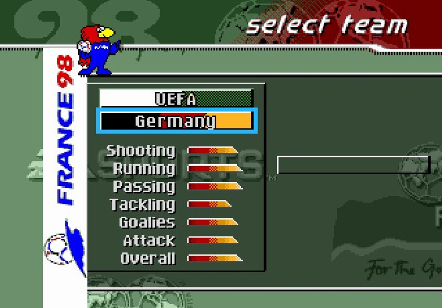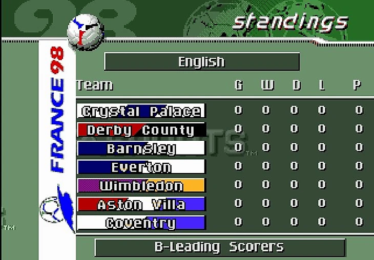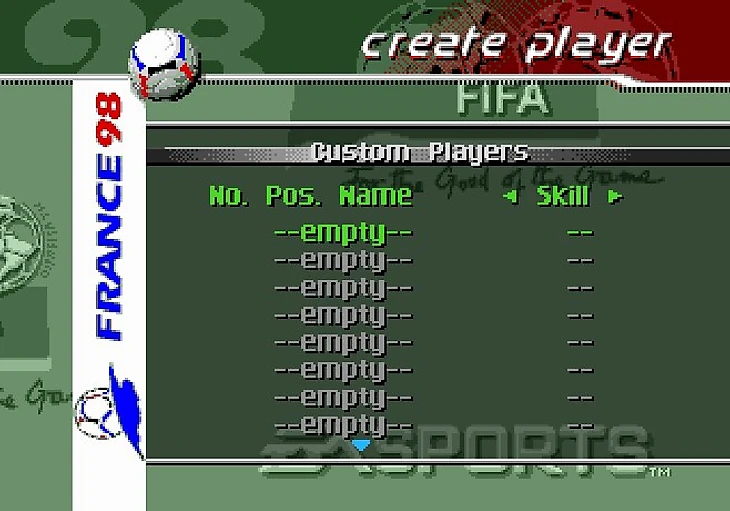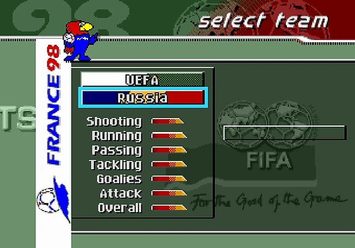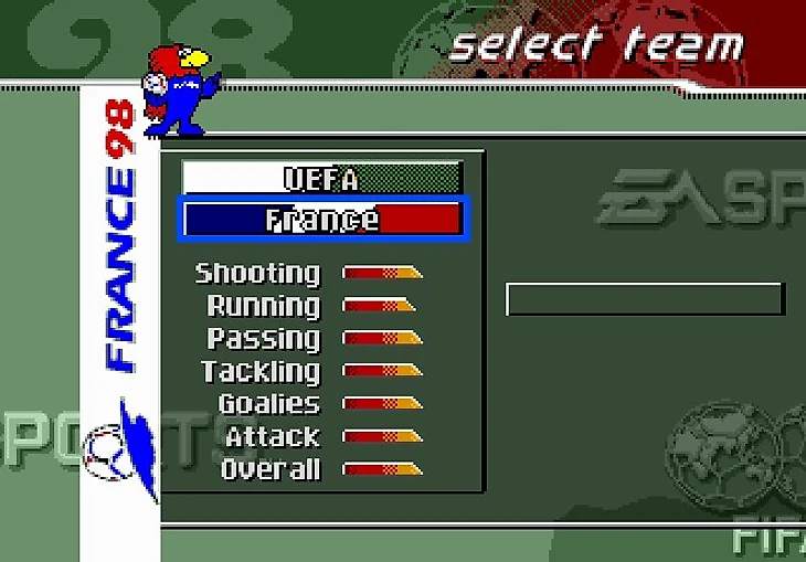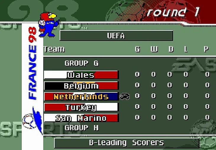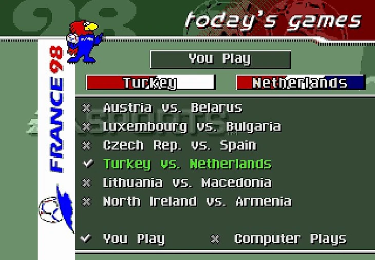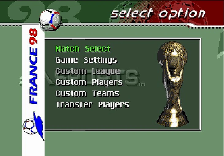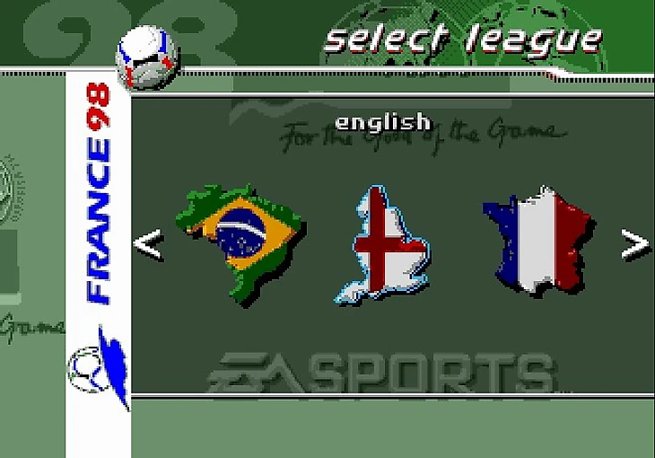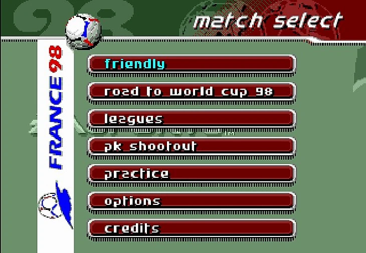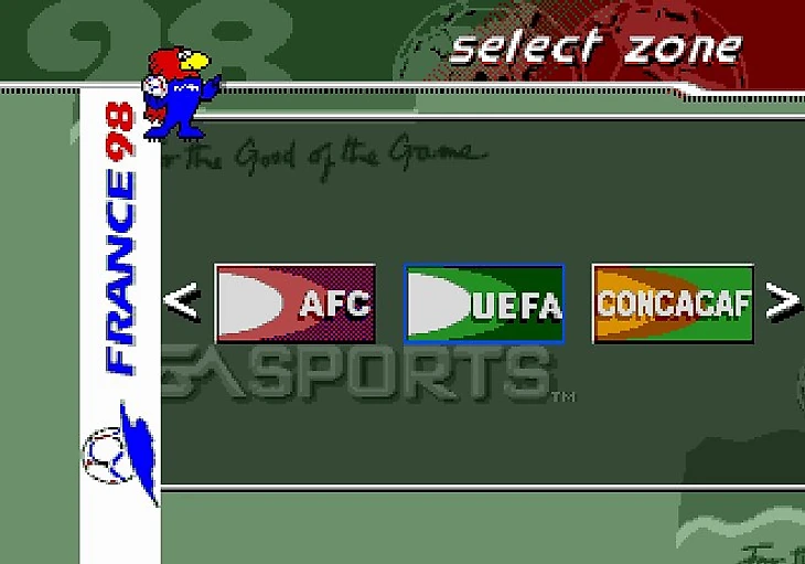 Я не стал скринить заставку и лого EA, всё пропустил и перебрался скорее к главному меню игры. Стоит отметить, что эта часть игры посвящена Чемпионату Мира по футболу 1998 года, так что первым делом я решил окунуться в мир отборочного турнира.