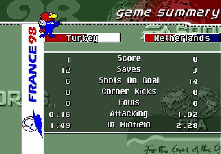 Подведу итог. Игра очень неплоха. Графика и звук на высоком уровне (для того времени). Можно потратить кучу времени на покорение вершины ЧМ98 или просто играя в чемпионате страны за любимую команду (кстати, в игре присутствует ооочень много их, включая Бразилию и США). Единственный минус на мой вгляд - это манера удара. Может я и не разобрался до конца, но эти парашюты меня вымораживают.
