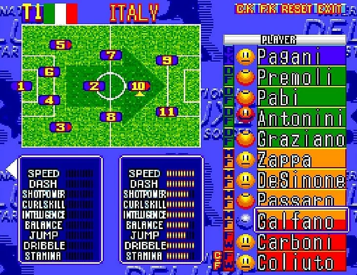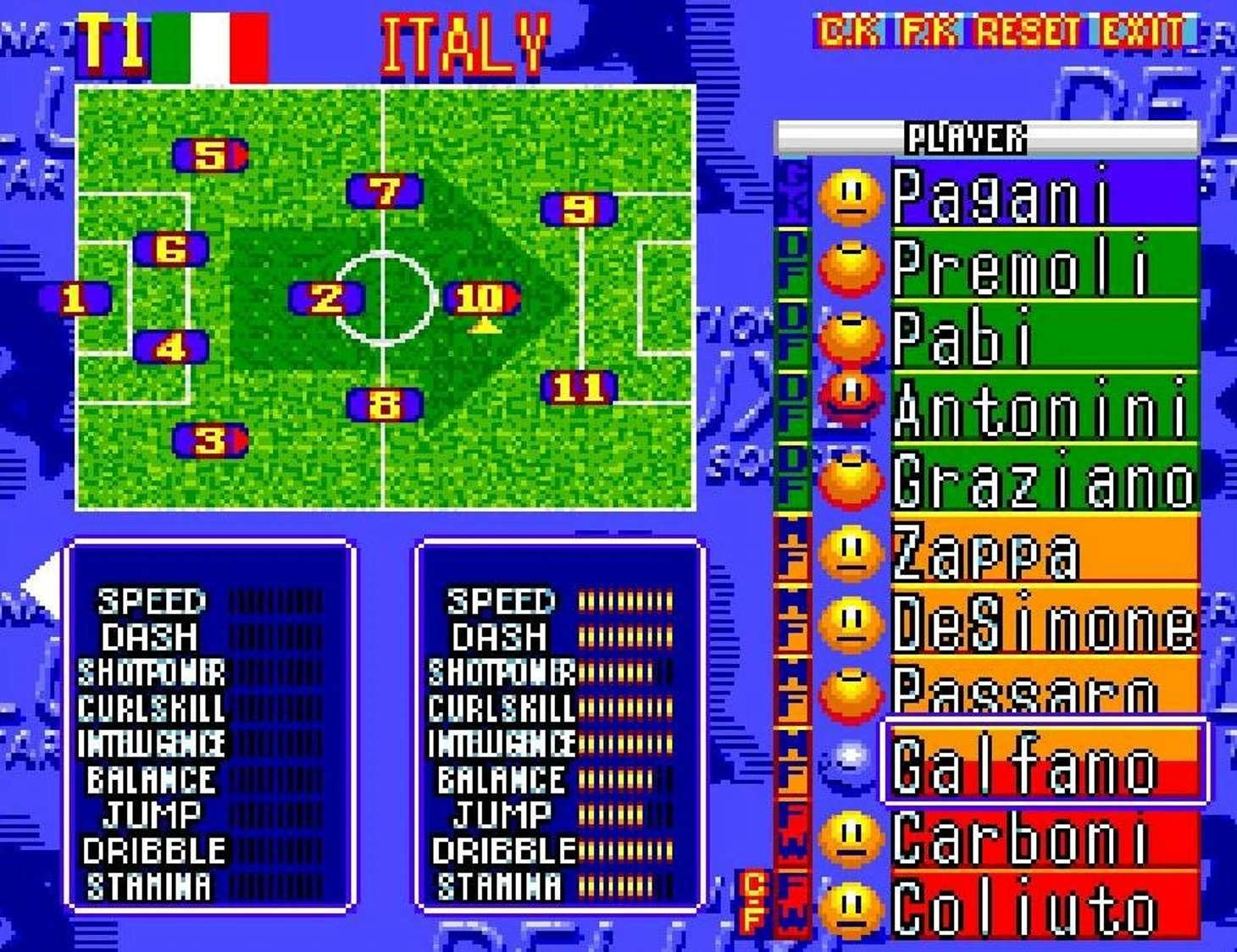 К сожалению, в "ISS Deluxe" не было лицензии на футболистов, поэтому все фамилии в ней "левые". Вот, например, состав сборной Италии (как я понял в дальнейшем, Гальфано здесь - это Роберто Баджо):