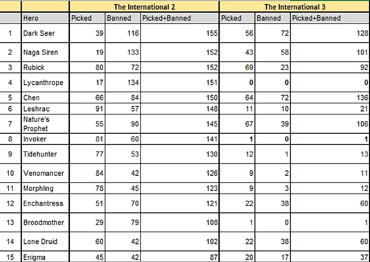 Раз уж я заговорил о The International 2, выложу таблицу, отображающую статистику драфта героев на этом турнире, и сравнение топ15 героев с их участием в драфте в 2013 году.