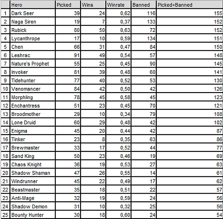 Отдельное спасибо блогу Nevuk'a, т.к dota academy накрылась медным тазом, и лишь с помощью его сохраненных таблиц можно было найти статистику по банам с TI2.