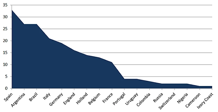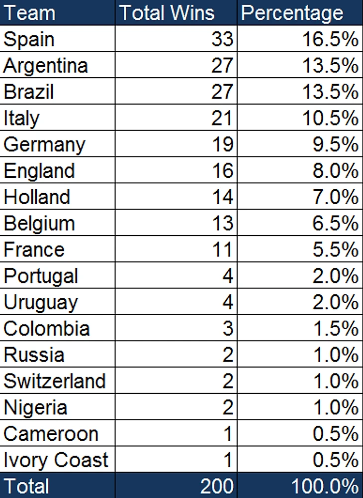 200 прогонов чемпионата мира дали аж 17 уникальных чемпионов. Сюпризов было не очень много, но такие сборные, как Россия, Швейцария, Нигерия, Камерун и Кот-д'Ивуар все-таки смогли выиграть турнир несколько раз.