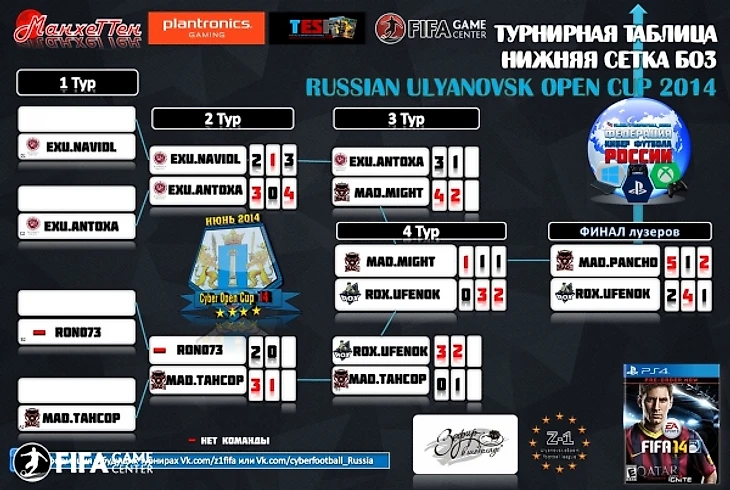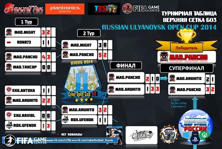 Итоги турнира:1 место – 8 500 рублей + кубок, медаль, грамота + фирменная гарнитура компании Plantronics + подарки от спонсоров - Владимир "mad.Pancho" Савельев 2 место – 4 500 рублей + медаль, грамота + фирменная гарнитура компании Plantronics + подарки от спонсоров и партнёров - Кирилл "mad.Aruhito" Ординарцев 3 место – 3 000 рублей + медаль, грамота + фирменная гарнитура компании Plantronics + подарки от спонсоров и партнёров - Роберт "RoX.Ufenok" Фахретдинов 4 место – 2 000 рублей + медаль, грамота + подарки от спонсоров и партнёров - Юрий "mad.M1ght" Сошинский 5-6 место – по 1 000 рублей + медаль, грамота + подарки от спонсоров и партнёров - Илья "mad.TaHCoP" Васильев и Anton "ExU.Antoxa" Zhukov 7-8 место – медаль, грамота + подарки от спонсоров и партнёров - Иван "ExU.Navidl" Можаров иДмитрий "Ron073" Галкин Спасибо всем участникам турнира, всем спонсорам и партнёрам. Отдельное спасибо компании Plantronics, EA SPORTS FIFA, Ульяновский государственный университет УлГУ, ТРЦ Аквамолл Ульяновск, Сэндвич Бар "МанхеТТен", а также сайтам Fifagc.ru , Resp.su , Turnirpro.com , PlayStation 4 клуб "Зефир в шоколаде" Ульяновск, к\к. Net-life