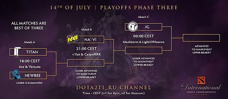 В седьмой день турнира, нас ждет опять таки 3 матча, и так как они будут идти в формате Bubble Race, то есть друг за другом, заранее прогнозы сделать невозможно, так что следите за моим твиттером https://twitter.com/v1lat, вся инфа по ставкам будет там. На первый же матч я ставлю 50 у.е. на NewBee за 1,398. Будем надеяться я отыграюсь, так как в общем за турнир я сейчас имею минус в размере 45 долларов на Egamingbets.com