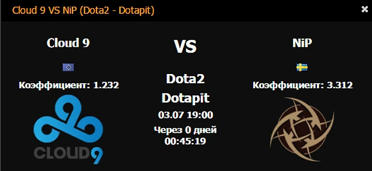 Скорее всего C9 в преддверии TI5 отнесутся к игре, как к возможности протестировать в боевых условиях новые стратегии и сочетания героев. NiP же напротив будут сверхмотивированы, так как пропускают главный турнир года и вряд ли удивят нас неожиданными решениями на стадии драфта. Гарантия 3х карт, нестандартных героев от EE-Sama и зрелищности - 70%