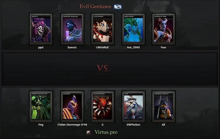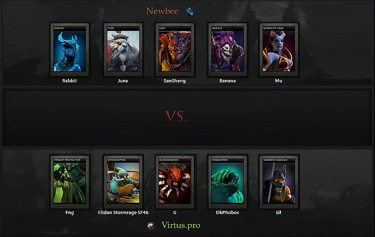 Две российских команды – Virtus.Pro и Empire попали в одну группу, но «медведи» (такая кличка у команды VP) свой матч начали первыми. Если NaVi – это агрессия в чистом виде – драки, драки, драки, драки, то VP и Empire демонстрируют большую склонность к стратегическому ведению войны. Это видно даже в пике. ФНГ для своей команды взял Tidehunter (большой крокодил, чьим главным достоинством является Ravage – ультимативная способность, которой можно выключить из игры сразу пятерых), Treant Protector (ходячее дерево, которое умеет лечить башни (единственный кто умеет это делать в игре), и – выключать из игры пятерых), Shadow Shaman (ставит огненные змейки, которые атакуют всё живое в пределах видимости) и два суперубивашки – знакомый нам вертолётик и Bloodseeker. Сразу виден акцент на большие массовые драки, которые и решили исход игры. Newbee с их ватными Лионом, Квопой, плохо наносящим урон Разором, Таском и почти бесполезным даззлом просто не смогли ничего противопоставить и закономерно проиграли.