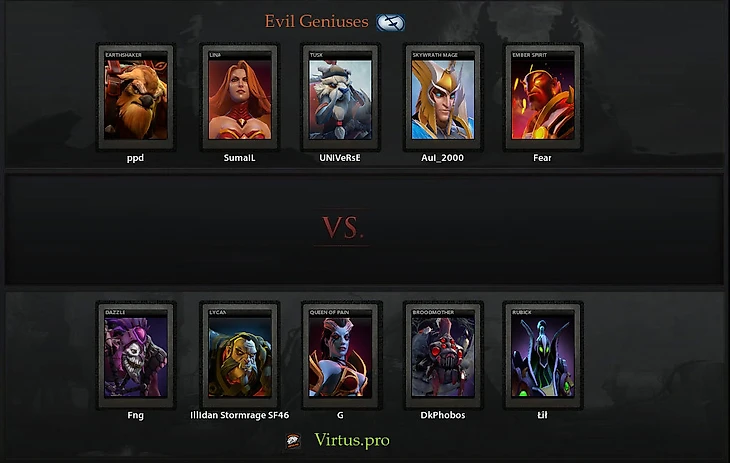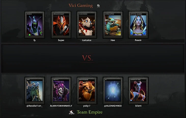 В первой игре против VG empire играет в старую как дота стратегию Io (шарик, который помогает своей команде, но практически бесполезен в одиночку) + Tiny (говорящий кусок камня, который с каждым левелом станосится всё больше и сильнее, и в конце уничтожает всё на свете), которым помогали Dazzle, Queen of Pain и Earthshaker. VG взяли Dragon Knight, что означало, что китайцы будут играть в очень быструю доту – только вперёд, бить врагов, сносить башни. Получилось бы затормозить – Empire бы скорее всего легко выиграли. Но затормозить не получилось, более того, Tiny дважды умер от огненного дыхания дракона. Тем не менее до поры до времени игра была равная, но Тини слишком медленно набирал мощь, а Дракон и Вертолётик слишком быстро ломали башни и базу. Драка на рошане, и на этом для Империи, пожалуй всё было закончено.