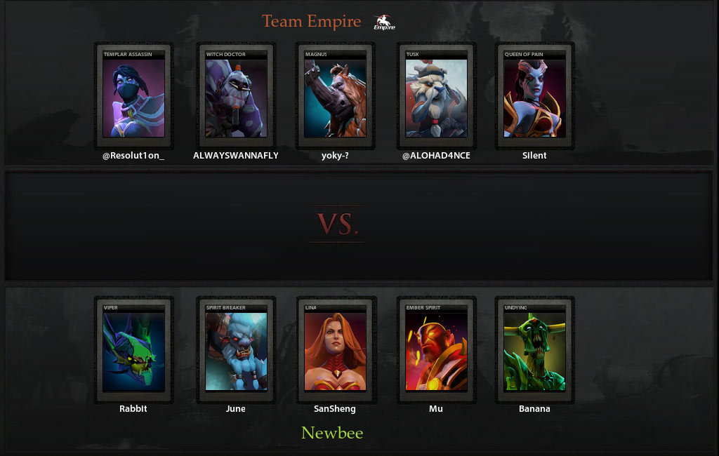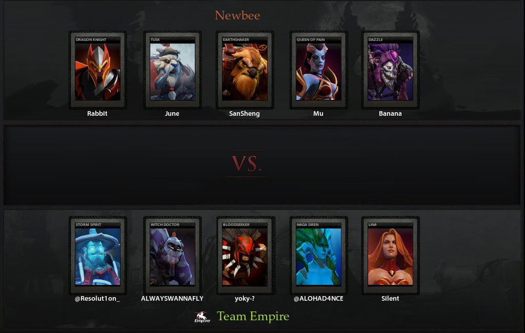Чуть-чуть подфидив Queen of Pain на сложной линии (особенно расстарался Alohadance на Наге), Empire уже не смогли её остановить. Пока Mu гонял героев Empire по карте Rabbit своим Драгоннайтом легко забирал вышки, и Newbee засноуболившись были уже неостановимы. Особенно, учитывая что Empire никак не могли толком зайти в драку и отправлялись в таверну по одному. Хотя мизерный шанс на камбек у них был - если бы только DK не уничтожал здания так легко.