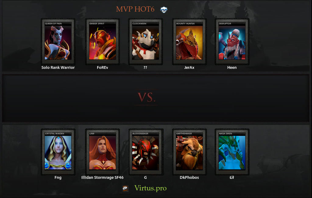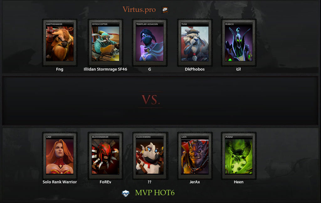 Первая игра против hot6 закончилась за 25 минут - так спокойно наши на этом турнире еще не выигрывали - Темлпарка, Туск, Гиро, Шейкер - слишком сильные ребята если разгонятся. MVP.hot6 умудрились взять в совершенно не приспособленный к пушу пик Пугну (единственное что умеет - уничтожать строение соперника). Ну и естественно, почти все драки на ранней стадии заканчивались победами VP, а разогнавшись Темпларка и Вертолётик уже не видели проблем в том, чтобы перебить всех на карте.
