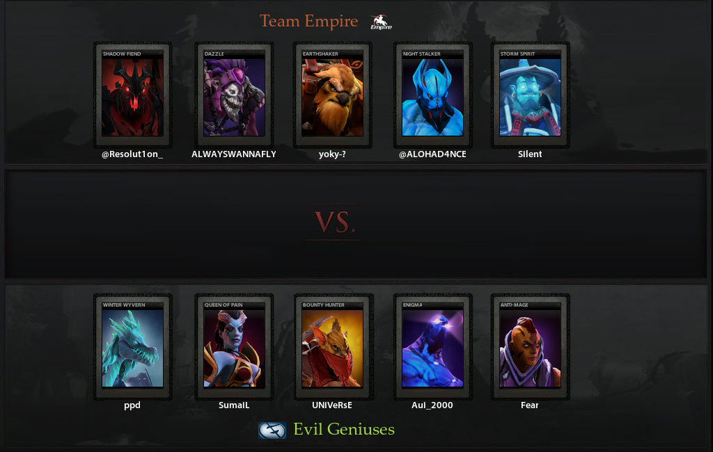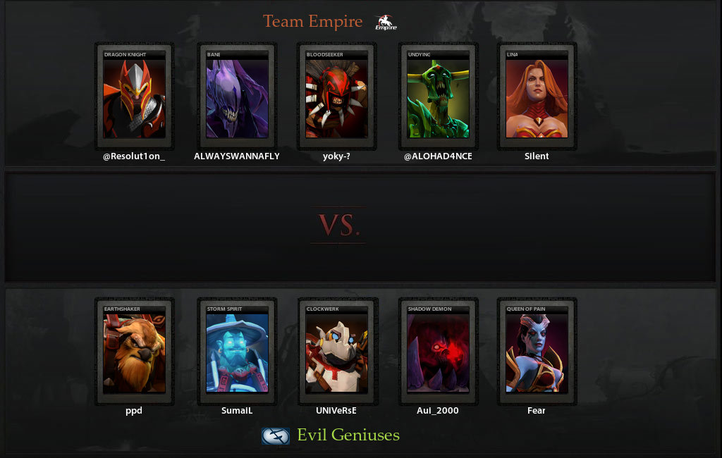 Сыграв с Newbee вничью, Empire не оставило себе выбора, кроме как цепляться за очки с Evil Geniuses, которые показывают просто космический уровень взаимодействия и понимания доты. Первая карта прошла совсем без шансов для империи - вновь не получилось остановить Квопу, на которой отыграл Сумаил, да еще и Fear на Антимаге за счёт фида имперцев получил все необходимые артефакты уже к получасу игры, показав сумасшедший GPM (количества золота в минуту - 768).