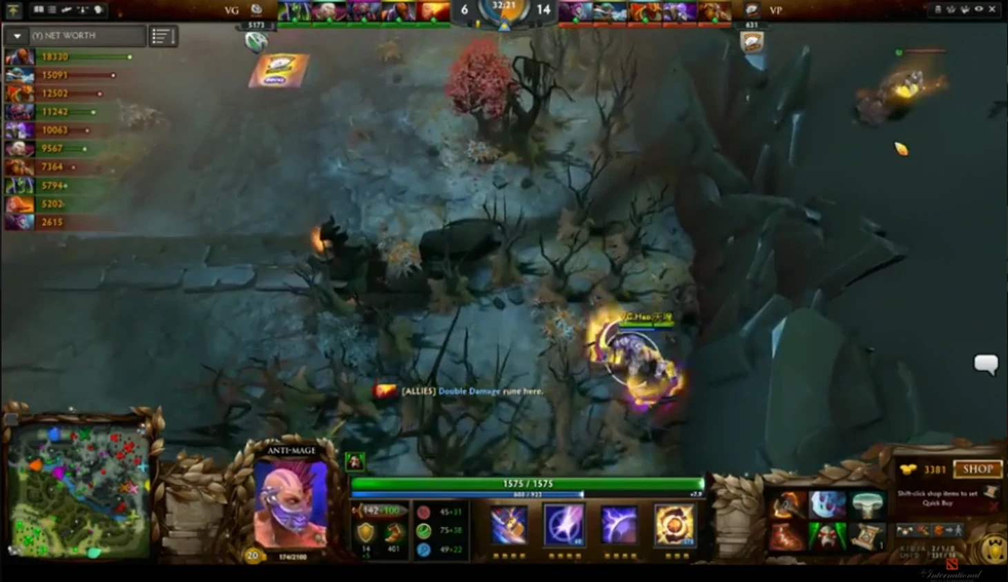 Буквально сразу после этого произошла, казалось, фатальная драка рядом с Рошаном, из-за которой пришлось выкупаться Иллидану, а VG получили аегис. Слава богу VP не свалились в фид-конвеер (и это важное отличие от Navi) - и смогли вернуться в эту игру, продолжив хладнокровно защищать свою базу и при возможности атаковать чужую. В одной из таких вылазок VP на морально-волевых дошли до чужой базы и не смотря на то, что потеряли четырех героев - уничтожили полторы стороны, гораздо облегчив себе задачу по защите от сплитпуша.