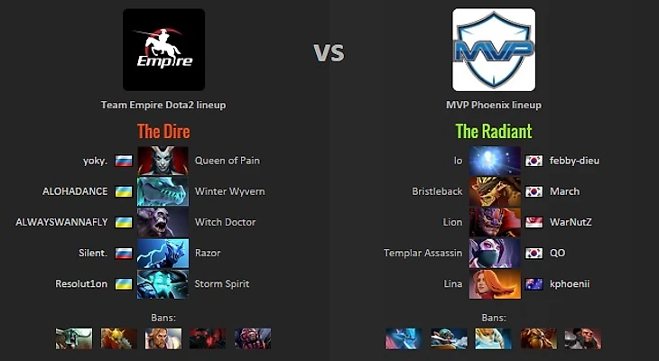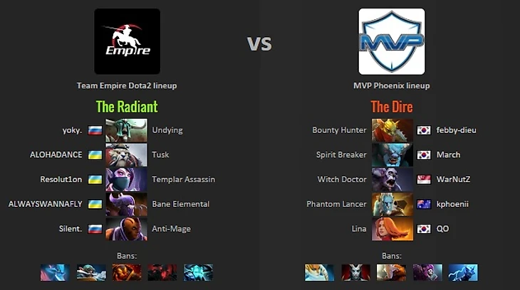 For the first game of the series MVP.Phoenix chose to draft a teamfight oriented lineup with a Bristleback – Io combo and a Templar Assassin for QO but got completely dominated by Empire in the early stage. The CIS aggressiveness was fully represented by Team Empire who focused to shut down the March – febby duo and lost QO’s Templar Assassin from sight.