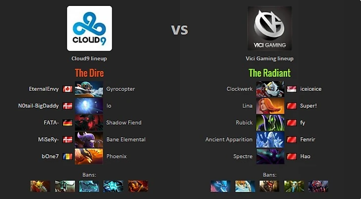 Vici Gaming came prepared with a global strategy that involved an Ancient Apparition third pick and a Hao Spectre for the last one while Cloud 9 went with a team fight oriented draft with Gyrocopter – Io combo and a Shadow Fiend for Fata.