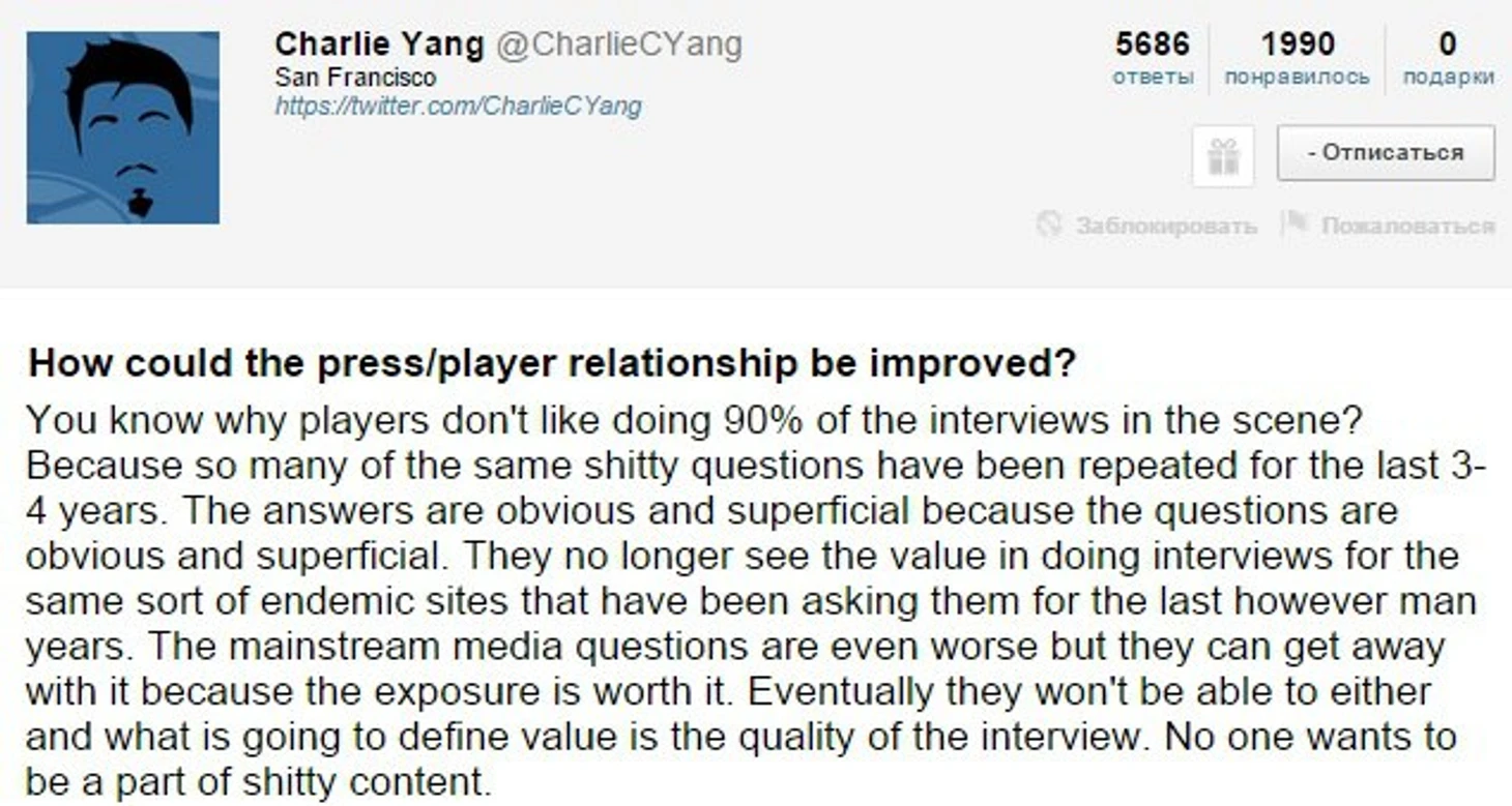Отдельный вопрос в системе киберспортивной «дурналистики» – это интервью. Не так давно о проблемах этого жанра говорил Чарли, менеджер EG. Говорил жестко, грубо, но правдиво. То, во что превратились вью в киберспорте – это набор стандартных вопросов «как дела, как турнир». Из раза в раз. Изо дня в день. А потом возмущения «а чего это игроки не хотят приходить на пресс-дни и вообще нас избегают?». Потому что единицы стараются раскрыть собеседника, а не просто задать вопросы по списочку из планшета.
