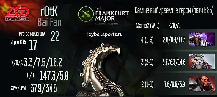Самого rOtK тоже вряд ли можно назвать примером для подражания. Заняв любимую тяжелую линию, он стал часто ошибаться, иногда полностью проваливая матч, несмотря на старания своей команды. В качестве примера можно вспомнить серию LGD–Virtus.Pro на MLG, где «медведи» просто разнесли соперника. Что случилось с китайским коллективом в тот момент – сложно сказать, но игра rOtK была ужасна.