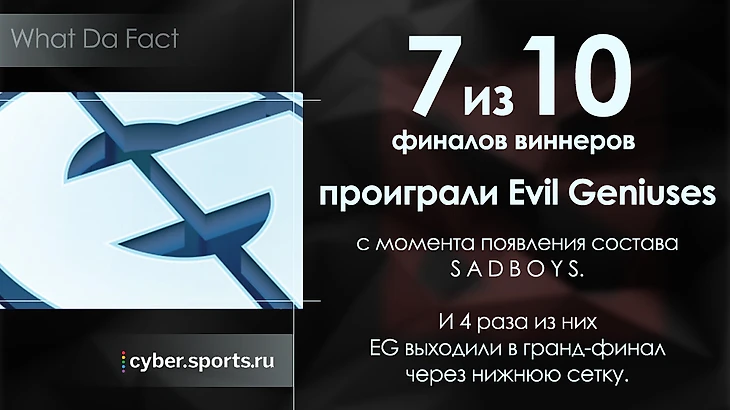 Свои финалы виннеров EG выигрывали только тогда, когда являлись явными фаворитами встречи. Однако поражение в верхней сетке становилось для них стимулом – и американцы практически всегда пробивались в гранд-финал турнира. Исключение составили StarLadder 9 (первый крупный LAN этого состава), TI4 и недавний Major.