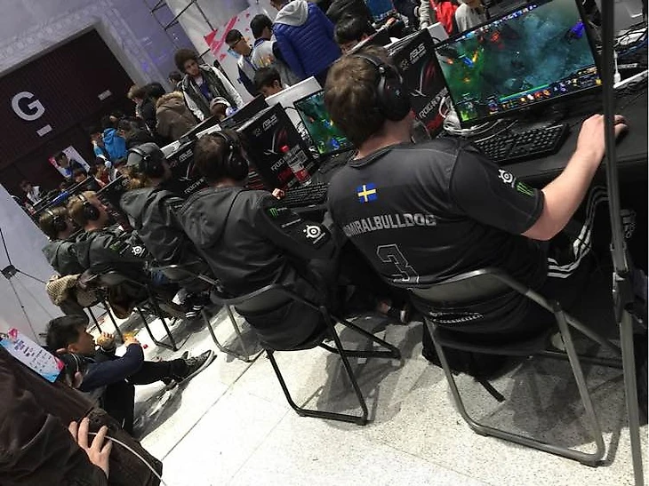 Через некоторое время я заметил ряд игроков, сидящих на узенькой скамейке позади стеклянных комнат. Тут-то я и догадался, что это и было место проведения турнира по Dota.