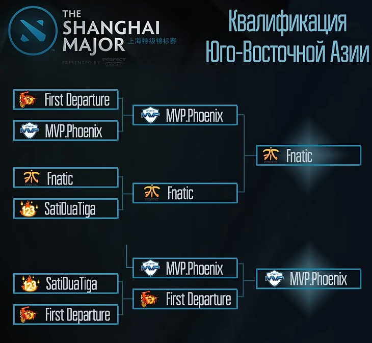 Во втором матче SatiDuaTiga сыграют против Fnatic. На выход SDT рассчитывали немногие, но парни утерли нос всем критикам и сумели пробиться в плей-офф. Не самый высокий класс игроков команда сумела компенсировать хорошими командными действиями, что и принесло им желанное второе место в группе. А вот «Короли» региона, Fnatic, как и ожидалось, заняли достаточно уверенную первую строчку в своей группе. Они, по традиции, остаются главными фаворитами квалификации, и пока в их поездке в Шанхай сомневаться не приходится. Их обновление в составе явно дает свои плоды: молодой мидер вполне может стать новой звездой, встав в один ряд с w33, Miracle и Sumail.