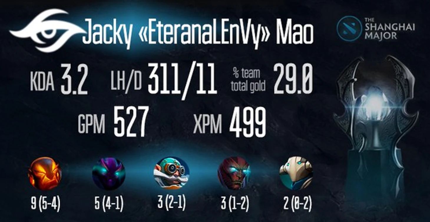 Джеки Мао. Самая спорная фигура в составе Secret. EE не раз допускал ошибки: его драки 1 vs 3 или отсутствие в драках, не самые понятные сборки – все это часто ставит его в ранг виновника во всех неудачах. MDL, где ЕЕ-сама был на роли драфтера, только усилил эффект. Апофеозом же стал его Terrorblade с Diffusal Blade в 3 матче четвертьфинала против NewBee. Но даже при всем этом EE-сама не раз доказывал, что умеет фармить и умеет побеждать. И возможно подобная игра от Джеки – лишь еще одна часть мозаики Клемента?