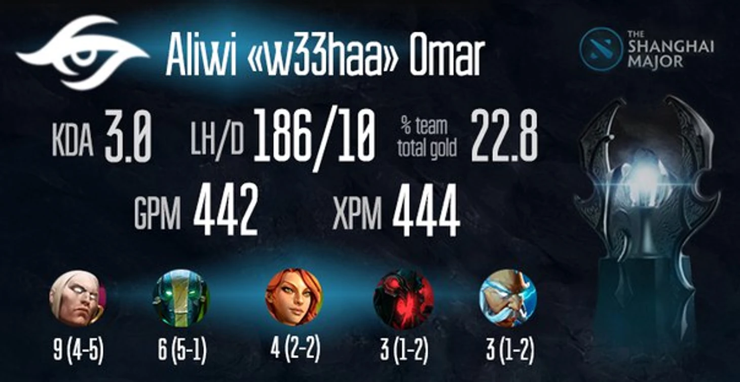 w33ha – единственное светлое пятно в «секретных» на данный момент, по крайней мере его ошибки не так заметны и не так критичны. В его игре мало что изменилось: он все так же уверенно стоит среднюю линию, много убивает, да и в целом показывает качественную игру. И он один из немногих, кто берет Earth Spirit в мид. Вот и получается, что Омар – главная надежда многих поклонников Team Secret на грядущем Major.