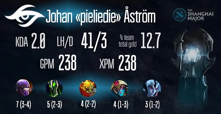 PieLieDie (он же «DieDieDie») в начале сезона называли игроком не уровня «секретных». Впрочем, ничего нового: о его любви к «фиду» знали все. Так что сейчас упреки в его адрес по поводу частых смертей не уместны, ведь осенью на них никто не обращал внимания, а его главный талант как раз и кроется в создании пространства для ЕЕ. Сейчас на фоне общей нестабильности команды от игры PLD почти нет толку: тактический фид явно не оправдывает себя. А ведь когда-то это работало: пока 2-3 героя пытаются убить PLD (чаще всего попытки не были напрасны), EE мог спокойно фармить, зная, что к нему никто не придет. Сейчас этого почти не видно, и PLD часто используется «не по назначению». Он очень важная часть «секретных», и, если все сделать правильно, приносит огромную пользу.