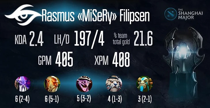 Misery, обладающий огромным опытом , сейчас не демонстрирует присущей ему стабильности, словно нервничая и допуская на этой почве нелепые ошибки. Его главным минусом в последнее время называют полное отсутствие креативности и пассивную игру, якобы ничего нового он в команду не принес. Если брать последние матчи, то в них вообще никто ничего в команду не принес, и винить во всем Misery – далеко не лучшее решение. Расмус отлично смотрится на инициаторах, но он не игрок-одиночка, который может исправить ошибки всей команды. Конечно, он и сам совершает их не мало, но при налаженном тимплее он всегда смотрелся здорово.