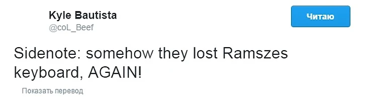 «Для заметки: Как-то они потеряли клавиатуру Ramzes666. ОПЯТЬ!» Ранее организаторы турнира уже теряли клавиатуру уже бывшего игрока Team Spirit во время первого дня плей-офф.