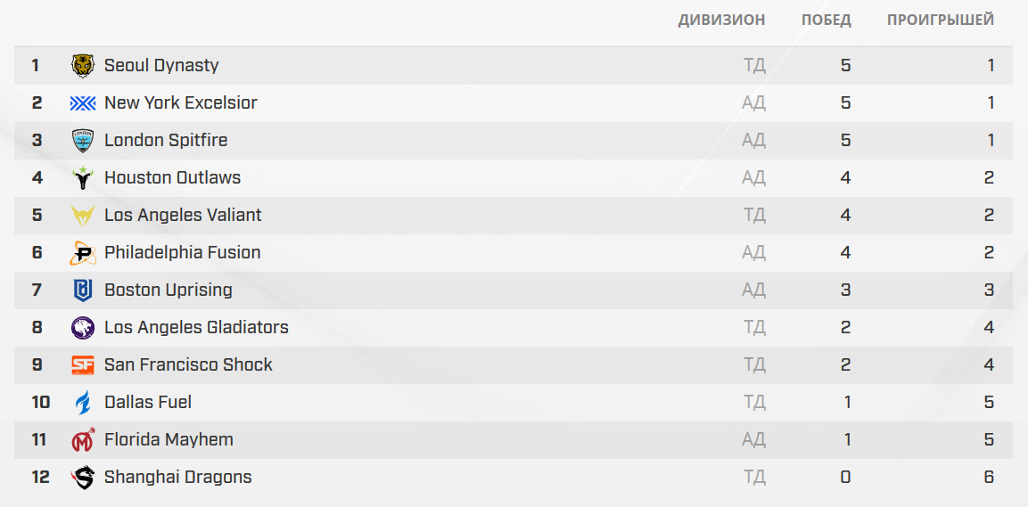 3:00 Seoul Dynasty 2:3 New York Excelsior5:00 Shanghai Dragons 2:3 Philadelphia Fusion7:00 Dallas Fuel 3:0 San Francisco Shock22:00 Dallas Fuel 2:3 Boston Uprising