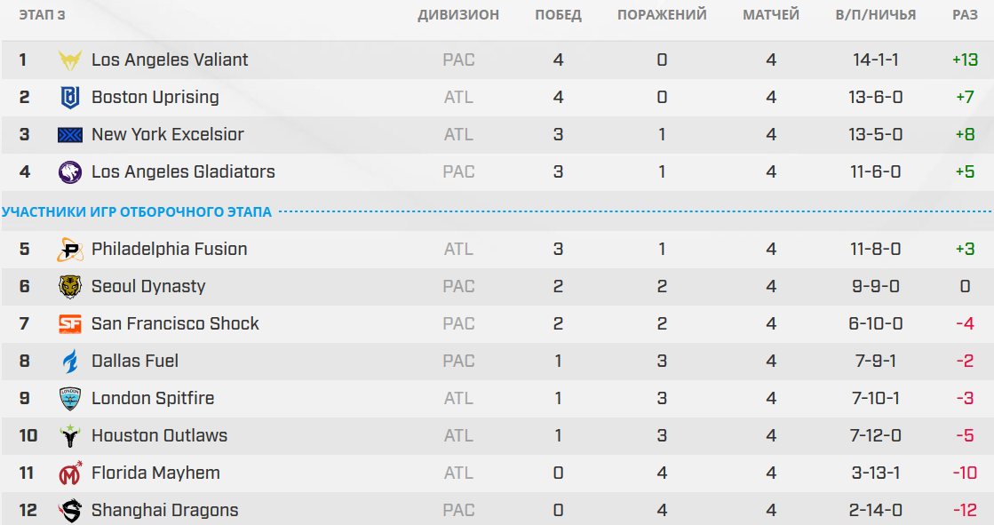 12 апреля Shanghai Dragons 0:4 Los Angeles GladiatorsSan Francisco Shock 0:4 Los Angeles Valiant Dallas Fuel 2:3 Seoul Dynasty